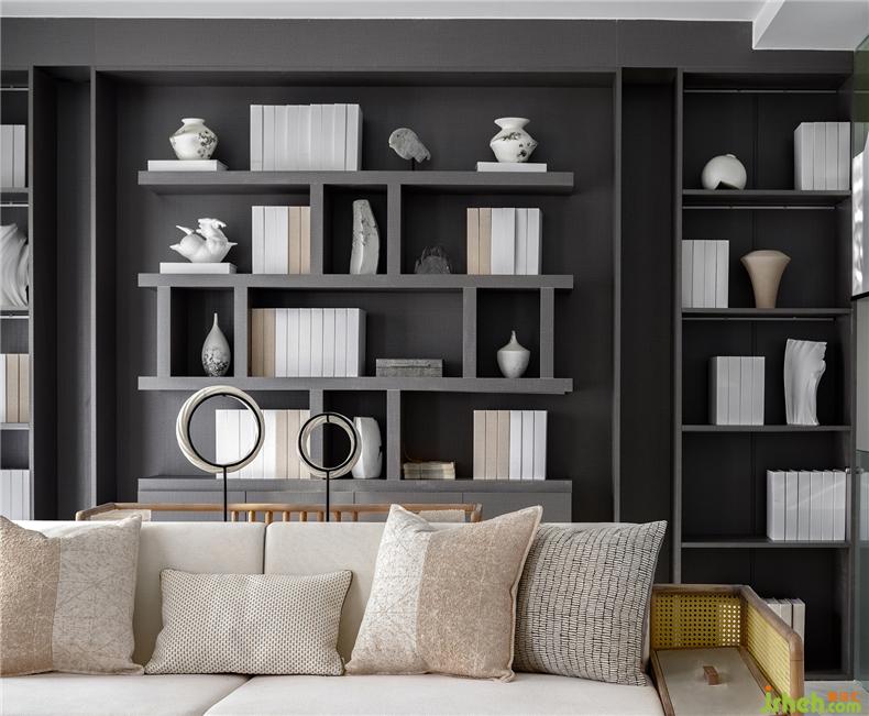 樣板房設計客廳留出一整面墻壁,將博古架進行現(xiàn)代形式的改良,陳列出主人的文化素養(yǎng)和高雅志趣。恣意生長的綠植、黑色線條與淺木色家具形成對比,流露藝術(shù)的極簡之美、空間的動靜之美