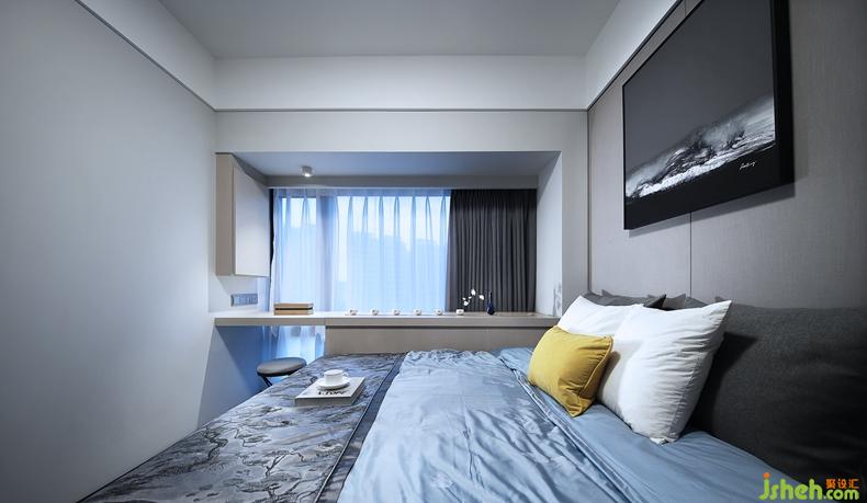 臥室床背景做了硬包背景,布料用了深灰色,和墻面的淺灰色呼應(yīng),窗簾的用色和靠枕用色一樣,掛畫(huà)用色和枕頭呼應(yīng),用一黃色為跳色,這樣整個(gè)空間不會(huì)太冷。