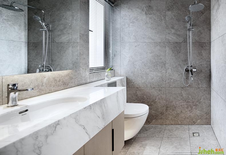 The toilet made a wall-hung toilet, the table with marble and wash table level, there is enough table to put things, wash table cabinet also do suspension design, afraid of damp cabinet, daughter is still small, now are two people with a basin to help her wash, so the shower with soft curtain, so the space will be larger.