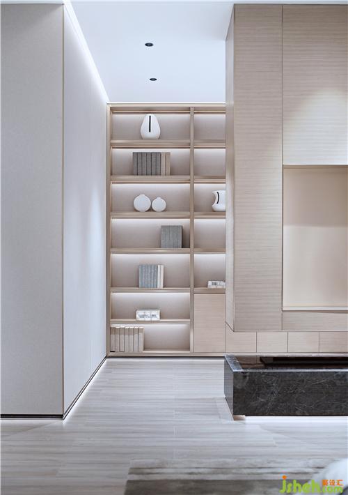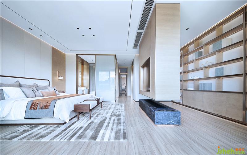 主臥在四樓,有一個(gè)超寬度的陽(yáng)臺(tái)和落地玻璃,采光特別好。主臥書房,衣帽間,衛(wèi)生間等功能,為了把空間設(shè)計(jì)的更靈動(dòng)和寬敞,書房的隔墻懸空,下方仿真火爐,天花平頂,四周洗墻燈帶。樣板房設(shè)計(jì)