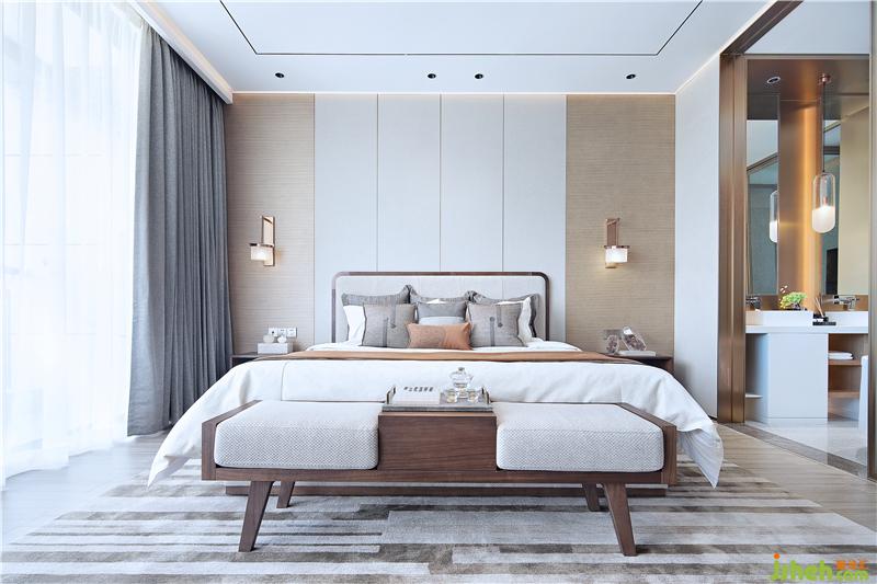 主臥無主燈設(shè)計(jì),天花四周洗墻燈帶,床頭防眩射燈,床頭背景點(diǎn)綴壁燈讓空間更溫馨。