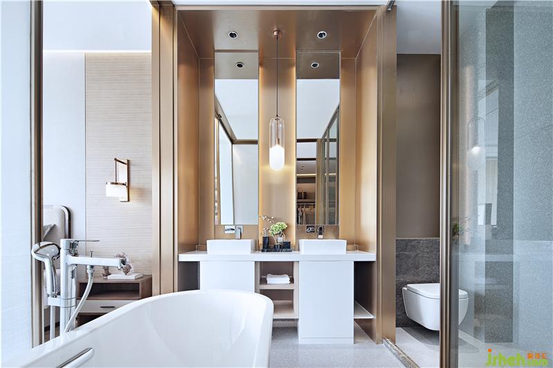 主衛(wèi)生間干濕分開,洗手臺(tái)背面材質(zhì)為不銹鋼,臺(tái)面人造石,燈光更注意細(xì)節(jié),有背景光,重點(diǎn)照明光和面部照明光。