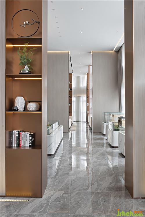 大理石臺(tái)的暖色金屬邊框呼應(yīng)著背后的金屬架,細(xì)節(jié)彰顯出統(tǒng)一和諧之感。