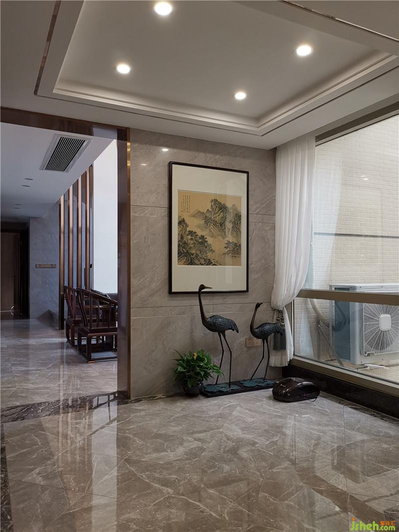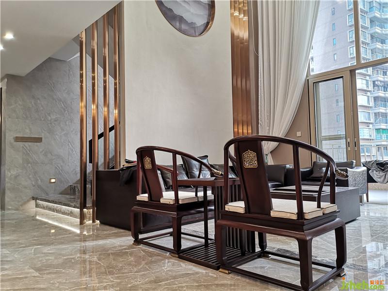 本項目面積為270方三層復式中空大廳戶型。風格定為現(xiàn)代時尚的新中式風。業(yè)主為職業(yè)教師,對美艷的新中式風尤為喜愛,設計時在現(xiàn)代時尚的手法上僅在意境上體現(xiàn)著簡約中式的表達方式,讓人既享受到時尚的優(yōu)雅,又感受到中式意境之韻,格調顯貴。本案例運用了大自然的天然石材-白金沙,該石材無論色澤或是紋理都渾然天成,一氣呵成,大氣灰宏,給人視覺沖擊甚為之高。整體空間均輔以奢華為代表的玫瑰金不銹鋼為裝飾線條,提升出時尚而奢華的空間氛圍和品位,兩側6米高的不銹鋼造型屏風以斜角45度為擺向,正如展示著主人趟開雙臂歡迎賓客一般,熱情,友愛,無比活躍。沙發(fā)背景墻面留白的處理,中間鑲嵌了一個整圓以美倫美奐的不銹鋼為邊,透著抽象的高低起伏的山群玻璃造型,正如每逢月圓人團圓的意境,更是增添了一份中式的神韻在此。室內設計師