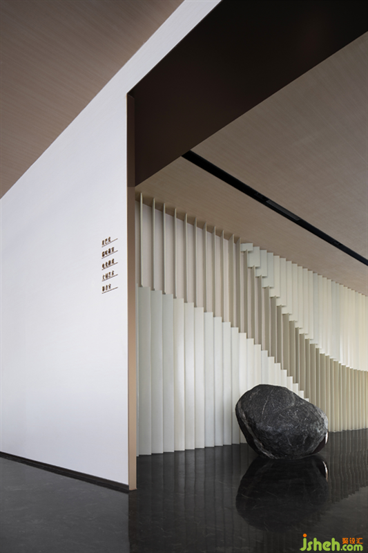 樣板房設(shè)計前廳以“白浪”的流動與“金石”的穩(wěn)定為整體設(shè)計的底層思維,將生命的動態(tài)凝練為藝術(shù)的靜止,使自然的靜止衍生出時光的流動。動靜之中,生活的美感得以闡釋和呈現(xiàn)。