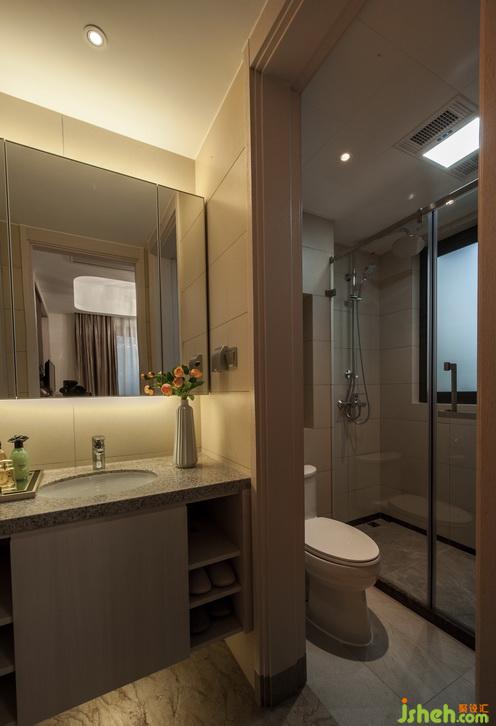 除了和一層盥洗空間一脈相承的1+1模式、儲(chǔ)存組柜、干濕分離等,考慮到早晚使用高峰期家庭成員的不同需求,洗手臺(tái)被外移到走道里。洗手臺(tái)外移后,讓沐浴有了足夠大的空間,通過(guò)精心設(shè)計(jì)的盥洗空間使洗漱、沐浴等各種活動(dòng)同時(shí)進(jìn)行時(shí)都能得到完美的滿足。