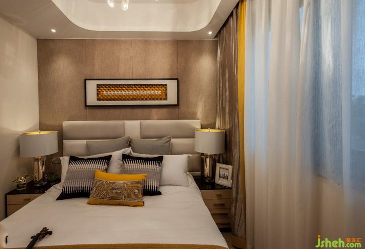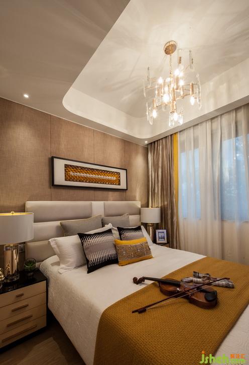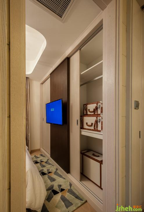 主人房最大的亮點(diǎn)是衣柜門和電視墻結(jié)合在一起,衣柜門即是電視墻。這樣既不用專門留出掛電視的墻面空間,又使衣柜完整如一,更能留出足夠大的空間讓擺放一張大床成為可能。主人房同樣采用軟包床頭,暖色調(diào)墻面,圓形倒角天花布局,使整個(gè)房間布局統(tǒng)一協(xié)調(diào)。