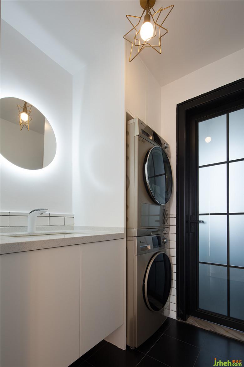 客衛(wèi)現(xiàn)場(chǎng)制作了洗衣機(jī)柜和洗手臺(tái),洗衣機(jī)烘干機(jī)堆著放更省空間。