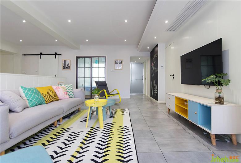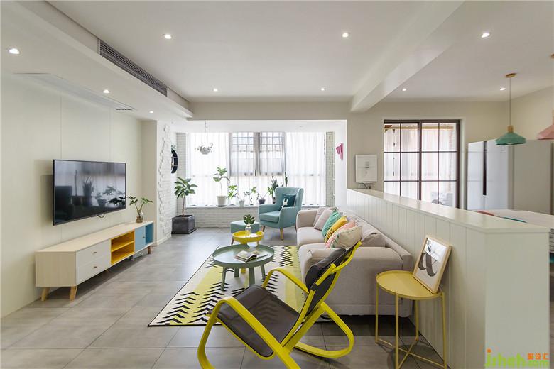 吧臺柜成為沙發(fā)背景,吧臺柜的設(shè)計,起著功能分區(qū)的作用,且在視覺上弱化了橫梁存在。米色一字形布藝沙發(fā),搭配簡潔的北歐風(fēng)茶幾邊幾,及糖果色抱枕、地毯,格外清新唯美。