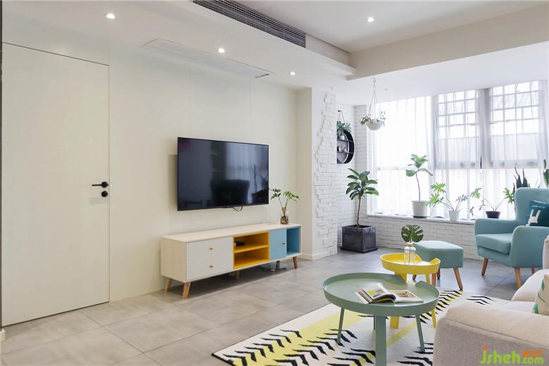 白色電視墻搭配跳色電視柜,與整體的格調(diào)一致。白色主臥門與背景墻一色,弱化了存在感,整體感更強(qiáng)。