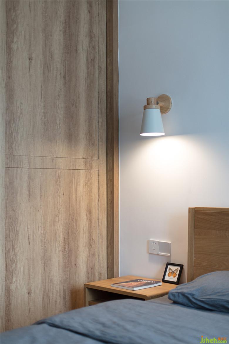 次臥,延續(xù)清簡(jiǎn)素樸的格調(diào),留白墻面搭配原木家具,油畫與壁燈與其他空間相互呼應(yīng)。