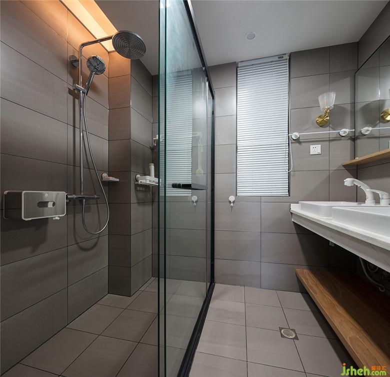 主衛(wèi)這種格局很少見,為了放下雙臺(tái)盆,衛(wèi)生間門設(shè)計(jì)成朝外開。洗手臺(tái)下水改成墻排,下面做了置物層板,方便放泡腳的盆。