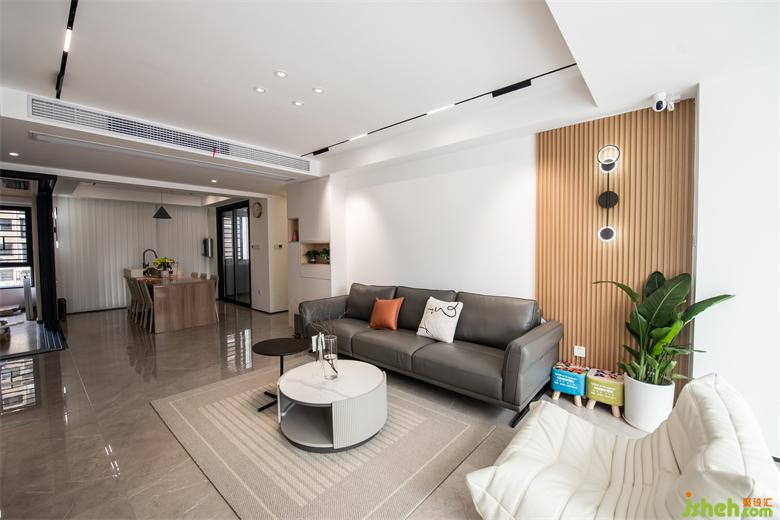 空間以白色及木色調(diào)為基底,大平層裝修設(shè)計(jì)搭配灰色的皮質(zhì)沙發(fā)、夢(mèng)幻簾,在良好的采光下營(yíng)造出透亮潔凈的視覺感受。