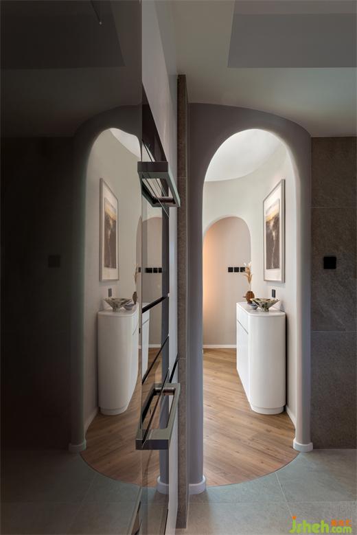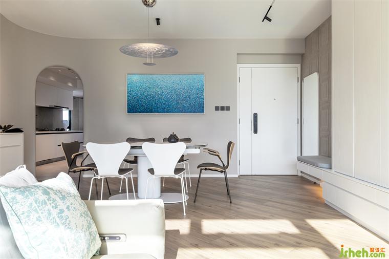 廖奕權(quán)唯一移動(dòng)的墻壁是將客用浴室與餐廳/客廳分隔的那堵墻;他將其推后以為更頻繁使用的公共區(qū)域提供額外的空間。重新定位墻壁意味著餐廳現(xiàn)在有了一些尷尬的角落,廖奕權(quán)認(rèn)為這些角落看起來不太舒服。他通過將它們變成優(yōu)雅的曲線來隱藏這些不雅的角落,并建造了兩個(gè)拱形入口,公寓設(shè)計(jì)分別通往走廊和廚房,而沒有門框。廖奕權(quán)通過使用帶有圓角的家具以及橢圓形餐桌上方的戲劇性圓形燈具來進(jìn)一步吸引人們對(duì)墻壁柔和形狀的注意。