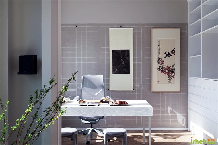 背景墻用上了精心設(shè)計(jì)過的定制網(wǎng)格圖案面板比例方格玻璃便于男戶主可以構(gòu)思畫作構(gòu)圖,并用磁性玻璃覆蓋,讓男戶主可以輕松“掛”起初稿藝術(shù)品,調(diào)整尺寸和框架。墻上掛上男戶主最珍貴的藝術(shù)收藏“藍(lán)瑛”的作品。