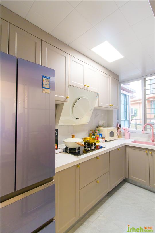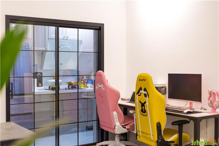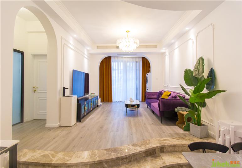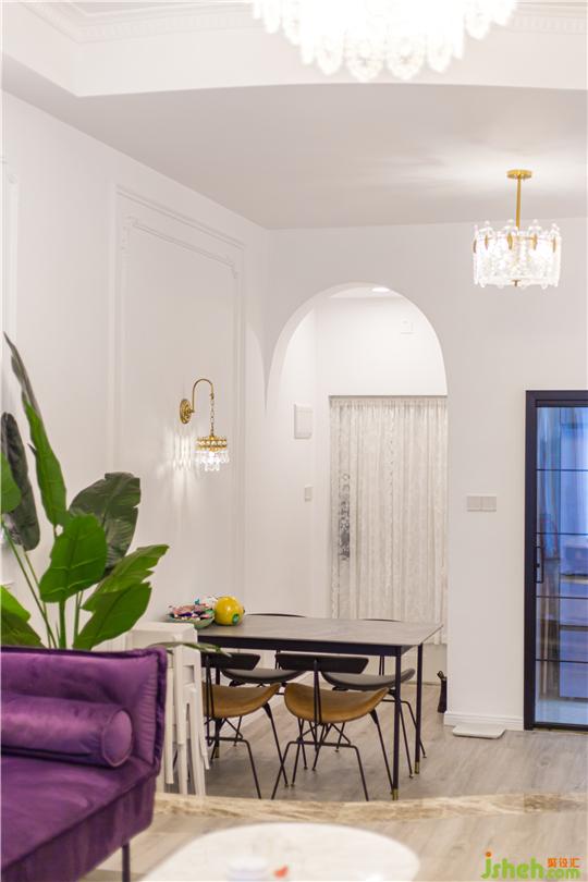 本案是一對年輕夫妻的新居,男主人喜歡電競,女主人喜歡攝影,是一位十分浪漫且時尚的人。深圳家裝設(shè)計在整體布局上充分結(jié)合了主人對空間的需求,將法式的浪漫與主人的優(yōu)雅氣質(zhì)相融合,選擇以法式輕奢風進行完美演繹,每一個細節(jié)都輕得起推敲,讓人身心愉悅。色彩方面選擇了較為少女的粉色,大面積留白,法式的雕花線條,構(gòu)筑了法式輕奢的迷人魅力,猶如同打開一個包裝精致的禮盒一般,滿足你的期待,又超出你的想象,應接不暇、意猶未盡。告別厚重的電視背景墻,選用復古黑色電視柜與茶幾相呼應,高貴的紫色布藝沙發(fā),配上暖棕色,微妙的平衡、意外的和諧。柔和的基調(diào)再搭配精致的法式雕花線條,讓整個客廳多了一絲俏皮的精致感。