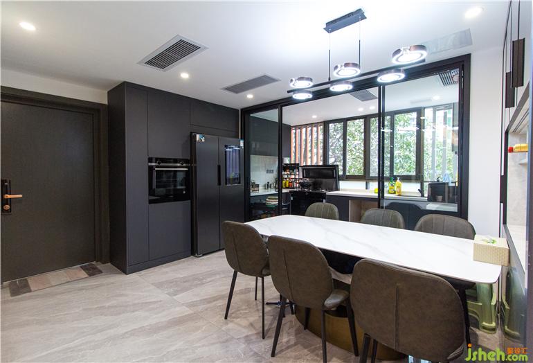 深圳現(xiàn)代設(shè)計空間上選用具有現(xiàn)代質(zhì)感的材料設(shè)計,內(nèi)斂的啞光材質(zhì),相比于閃耀的亮面材質(zhì),更加凸顯空間質(zhì)感。深淺咖色的木質(zhì)背景色和白色的大理石顏色形成鮮明對比,展示性豐富的柜體立面,整個客廳給人眼前一亮,營造出大氣的空間氛圍。黑色的意式皮沙發(fā)與極具質(zhì)感的黑色布藝窗簾,跟餐廳的電器柜相互呼應(yīng),整體色調(diào)和諧統(tǒng)一,彰顯品質(zhì)。寬闊的空間格局,通透明亮,黑色的色調(diào)設(shè)計在這里一點都不壓抑。深色配色風(fēng)格中,極具視覺張力的色彩,構(gòu)成剛剛好的空間溫度。