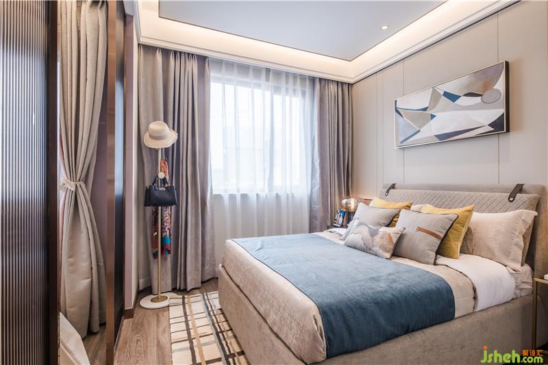 次臥的床品軟裝陳設(shè)與背景墻的掛畫在色彩和形式上呈現(xiàn)自然呼應(yīng)關(guān)系,輕微的撞色,簡約不鑿的塊面組合,共同形構(gòu)出時尚而溫馨的空間魅力。