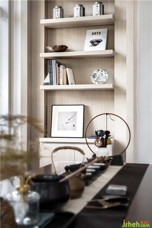 怡然自得的空間氛圍中,散逸著濃郁的人文氣息。設(shè)計(jì)師將幾十枚形制不一的杯盞陳列于一整面背景墻,精美的茶盞由此凸顯出獨(dú)到的藝術(shù)韻味,無(wú)用之美,在靜寂中流淌。