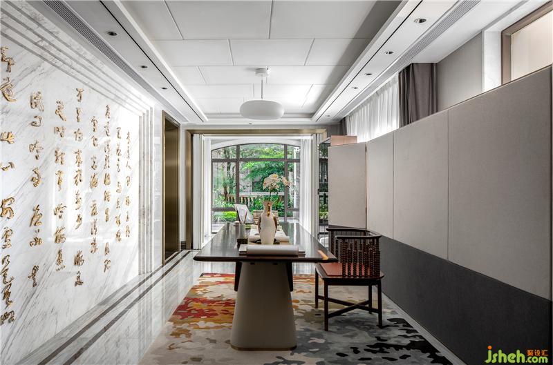 明亮的自然光照、古雅別致的圈椅、富有表現(xiàn)力的墻面鏤刻書(shū)法字,設(shè)計(jì)師在書(shū)法室這一隅空間中體現(xiàn)了許多不同尋常的室內(nèi)細(xì)節(jié),且讓每個(gè)元素和諧地兼容在一起。別墅裝修設(shè)計(jì)