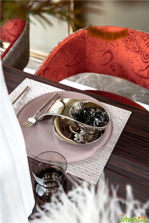 折衷美學(xué)講求比列均衡,注重形式美,設(shè)計師將這種特質(zhì)于餐廳空間中加以重點呈現(xiàn)。整體空間涵容著一種閑適的自信、沉淀著優(yōu)雅的韻致,墻面板與裝飾畫的搭配保留了一絲古典的豐神情韻,紅色靠椅搭配流光溢彩的餐桌和西式餐具,演繹日常生活的豐瞻之美。