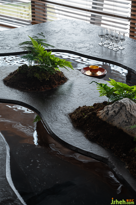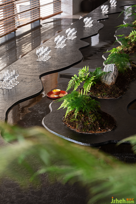 魏晉時(shí)期,名士自有風(fēng)流。永和九年三月初三,蘭亭雅集,被后世傳為千古佳話。之后曲水流觴便成為文人聚會時(shí)的一種水畔飲酒行樂的活動。在本案空間中,SEPD圣易文設(shè)計(jì)將傳統(tǒng)文化中“曲水流觴”的概念引入到辦公樓設(shè)計(jì)中,將清泉、流水、綠苔等引入室內(nèi)空間,用現(xiàn)代的語言重新演繹古人在溪水河畔飲茶、吟詩、作畫的文人雅興。