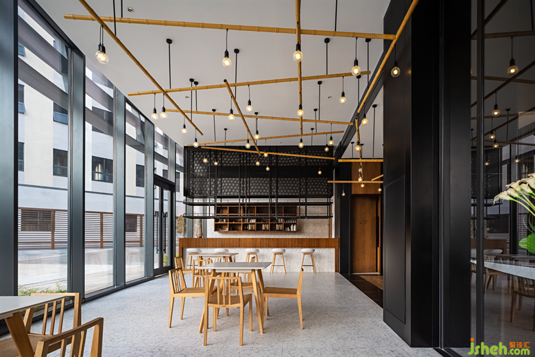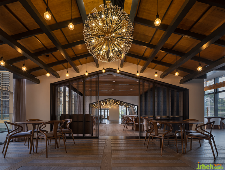 在這里,設(shè)計(jì)師特意營造一個(gè)舒適清和的就餐空間,也為日常休息時(shí)相互交流、情感溝通等提供了一個(gè)富有生活滋味的放松場所。設(shè)計(jì)將天然色系引入空間,整體自然清雅,中與西、新與舊互相融合,營造出和諧的空間氛圍,無論是木飾還是黑色鐵藝,中式風(fēng)靠椅還是現(xiàn)代感的吊燈,無不服務(wù)于空間整體和諧清雅的氣質(zhì)。