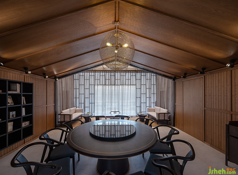 棕色的原木感染著一種寧靜沉穩(wěn)的力量,簡約內(nèi)斂的新中式家具搭配自然的花藝,共同創(chuàng)造出一種優(yōu)雅不失自然、樸質(zhì)不乏尊貴的場所精神。