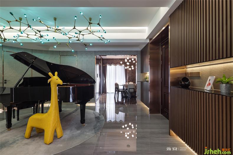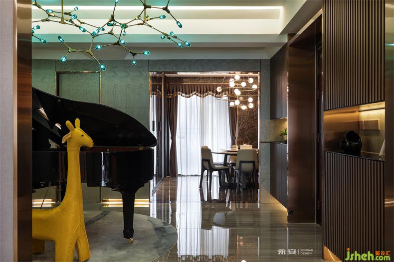 入戶玄關(guān),色彩融入雀眼木色整體搭配古銅色。深圳豪宅設(shè)計(jì)經(jīng)典百搭的灰色系與光芒四射的金色截然不同,正是這種強(qiáng)烈的反差印象,留給人無(wú)限的對(duì)家居的遐想與探究意趣。三角鋼琴的擺設(shè),不僅提升了整體空間的藝術(shù)性,更讓氣氛渲染的大氣端莊。