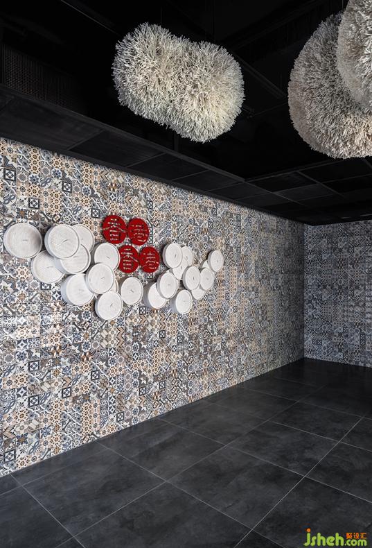 入口主題墻上的籠屜與LOGO組成的主視覺,花磚復(fù)古有種老港情懷,反襯出主形象的時尚現(xiàn)代。屋頂?shù)鯍禧溄昭b飾球如同風(fēng)滾草聚散得當(dāng)。