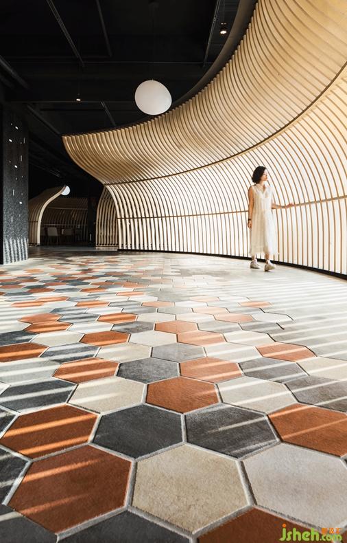 進入營業(yè)區(qū),屋頂和地面以極簡方式呈現(xiàn),退為背景,素水泥平滑無縫,六角磚以組團形式嵌入其中,活潑清新,這一切手法都為襯托空間造型做好準(zhǔn)備。