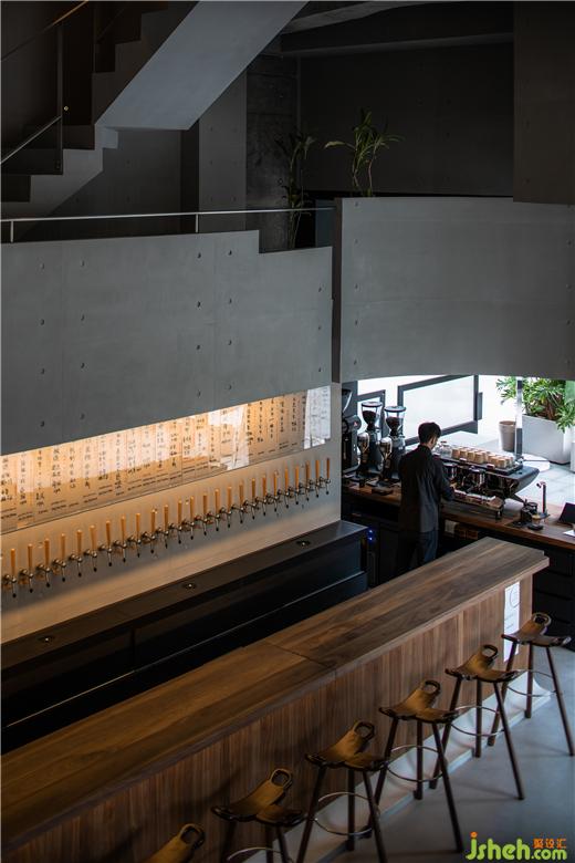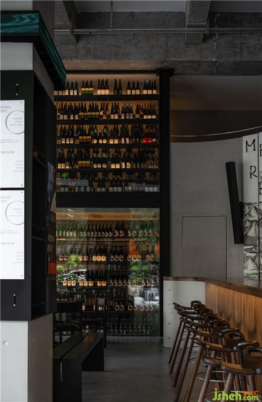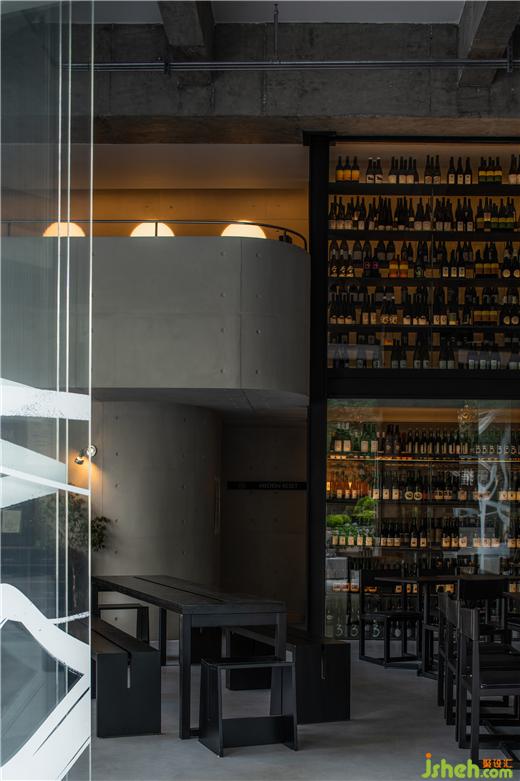 在這個雕塑感強(qiáng)烈的、有著通高天花板的空間內(nèi),空間的尺度關(guān)系從一般經(jīng)驗(yàn)中被放大,成都藥廠精釀酒吧設(shè)計為了增強(qiáng)這種大尺度的戲劇體驗(yàn),設(shè)計上利用垂直空高的優(yōu)勢,將酒類陳列于室內(nèi)視覺的開放區(qū),形成一個立體的、矩陣式結(jié)構(gòu)的6米高玻璃酒房。人在酒房的狀態(tài),既體現(xiàn)為一種對空間尺度的丈量,也暗合著一種對酒精烈度的丈量。