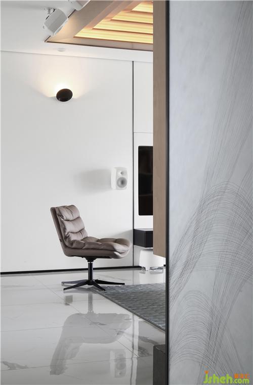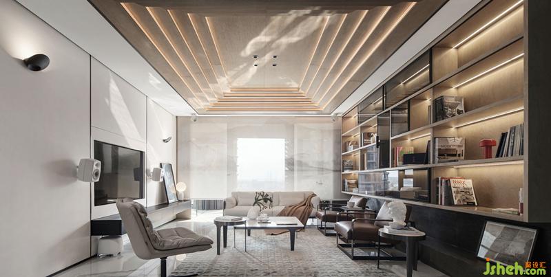整面書架結(jié)構(gòu)作為客廳的中堂,當(dāng)中呈現(xiàn)出“正”字背景。這是父親留下的做人做事立于“正”字根本,“凜然正氣,天地合一”,取其意、取其境、用其韻。“正”字前方有兩張現(xiàn)代單人椅為正坐南京裝修設(shè)計(jì),家訓(xùn)時刻提醒著主人夫婦。頂面結(jié)構(gòu)依然保持對稱,層疊出五個層次,象征五行之?dāng)?shù):“循環(huán)相生、剛?cè)岵?jì)”。設(shè)計(jì)另比作是“年輪”,有成長的寓意。一個居所要有生命體系,就好比樹木一樣,在自然中應(yīng)生機(jī)盎然,因此所用的材質(zhì)是胡桃木,自然的紋理充滿著生命的有機(jī)力量。