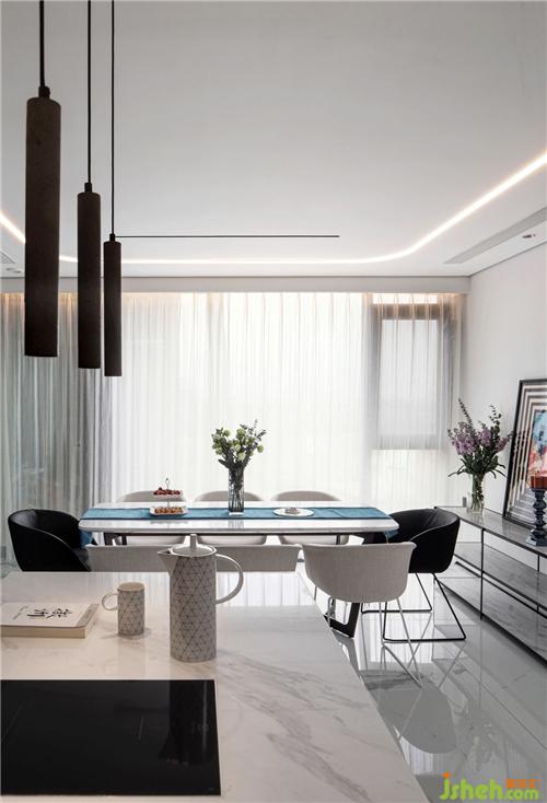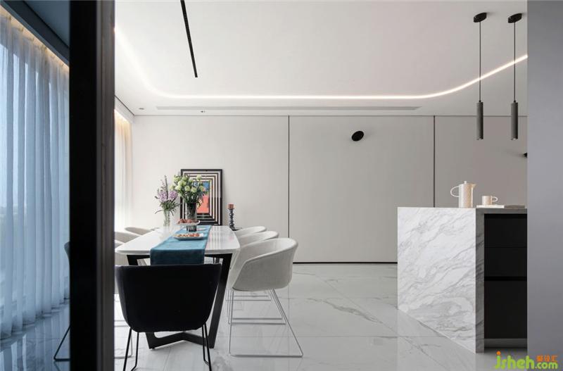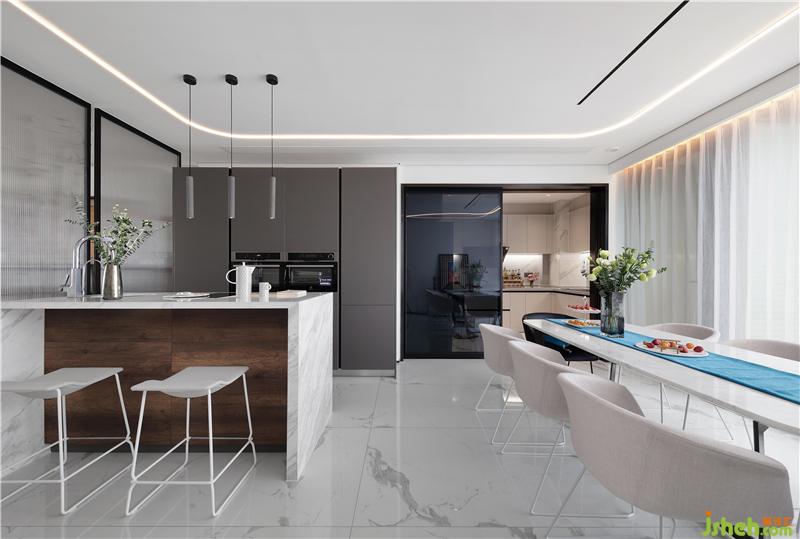透著餐廳的光,紫竹影在玻璃隔斷上。女主人正在島臺為小孩做早餐,自由自在的一天從這個西式的早餐開始,怡然、愜意??拷泵娌AТ笆羌彝?人長餐桌南京裝修設(shè)計(jì),這正是設(shè)計(jì)師記憶中兒時情景的設(shè)計(jì):同樣的傍晚,一家人坐在這里享用晚餐,看著窗外的景色與天空漸黑的過程,爸爸對著兒子、女兒說起曾經(jīng)的故事......