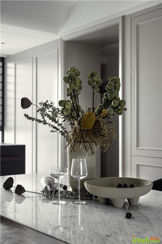 家裝設(shè)計(jì)以亞馬遜綠巖板背景墻引入,正中為浮雕三角錐形式的矩形柜,其上的干花隨性散漫,自由與慵懶撲面而來(lái),同時(shí)具有延展性的兩條線形燈光勾勒出空間的輪廓感,加強(qiáng)整體的視覺(jué)亮點(diǎn)。