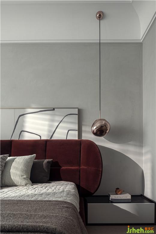 主臥以半高的黑白筆觸屏風(fēng)作為床頭背景,頗顯隨性自由的態(tài)度。家裝設(shè)計(jì)以棕紅色飾面為主,點(diǎn)綴金屬質(zhì)感裝飾,和柔軟的灰色床品共同營(yíng)造出舒適優(yōu)雅的休憩空間。