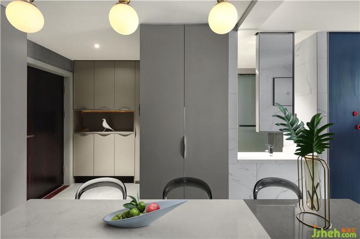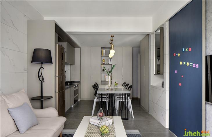 空間規(guī)劃了入戶玄關(guān)區(qū)、就餐區(qū)、兒童游樂(lè)區(qū)、沙發(fā)區(qū)、洗簌區(qū),倆臥室、衛(wèi)生間、陽(yáng)臺(tái)。入口是一個(gè)玄關(guān)區(qū)域,原結(jié)構(gòu)大門直對(duì)這臥室門,臥室門又直接對(duì)著窗戶,這在風(fēng)水上是忌諱的,所以設(shè)計(jì)一個(gè)玄關(guān)區(qū)域,一盆綠色植物讓空間充滿了靈動(dòng)。餐桌是自己定制的,2.3米長(zhǎng),分為兩部分,就餐區(qū)及裝飾區(qū),灰白大理石的臺(tái)面及定制的黑色鐵架腳。沒(méi)事的時(shí)候就跟孩子在桌面上玩游戲,很好。一扇移動(dòng)的深藍(lán)色黑板推拉門,連接了兒童游樂(lè)區(qū)及沙發(fā)區(qū)域,客廳電視藏在背后,想看電視的時(shí)候輕輕移動(dòng)推拉門,電視就完全呈現(xiàn)出來(lái)。餐桌旁特意制作了個(gè)柜子,做為孩子的收納柜,孩子玩好玩具,就收納在柜子里,這樣,就不會(huì)凌亂了。大理石制作的洗漱臺(tái)及懸掛的鏡子,讓采光及通風(fēng)得到了良好的作用。