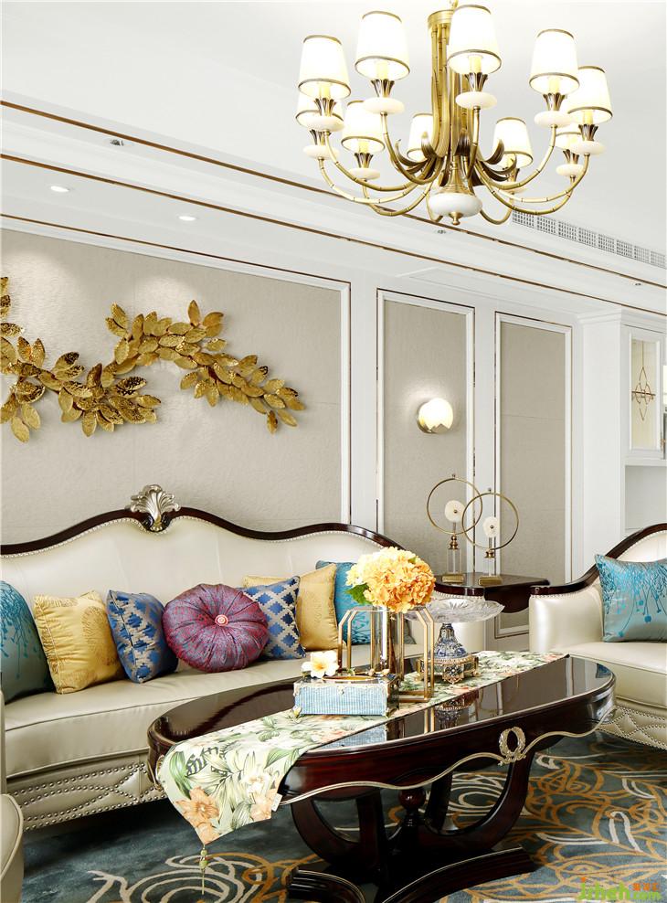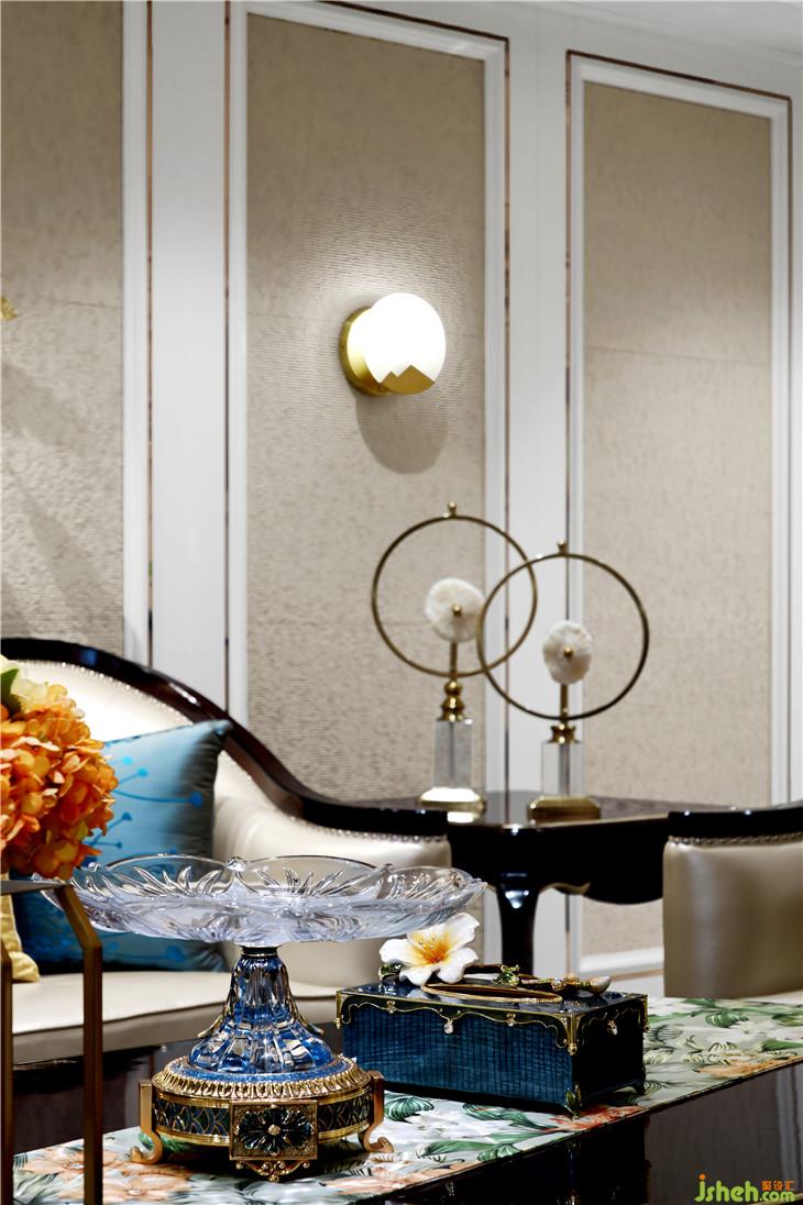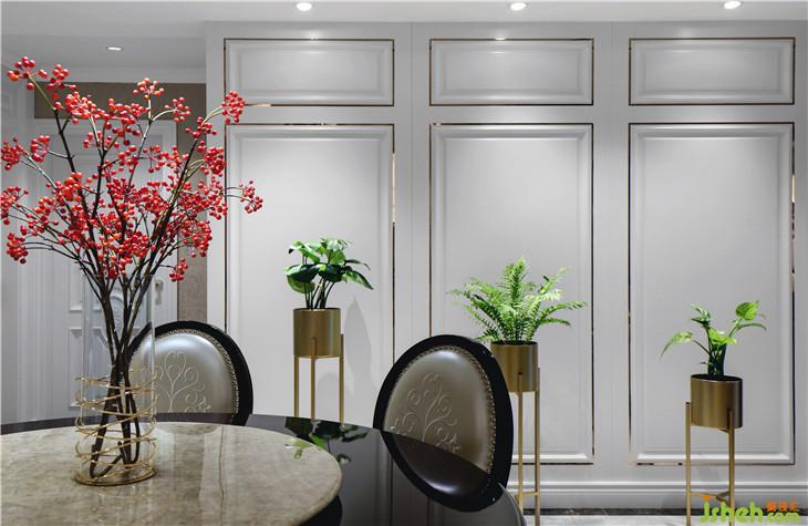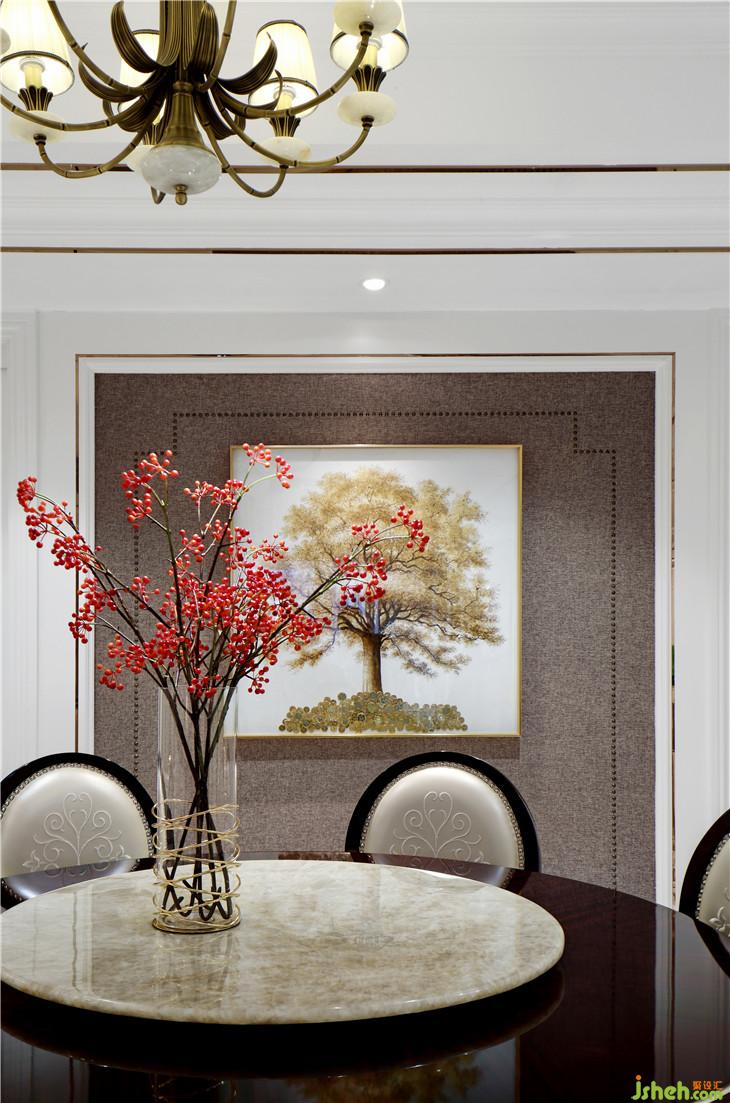 本案的業(yè)主尤為的喜歡白色及金屬色。白色代表著代表著純潔、端莊。金屬代表這尊貴。為了體現(xiàn)業(yè)主的高貴,運(yùn)用了金屬線條跟白色烤漆板的結(jié)合,使得整個(gè)空間多了一份高貴??蛷d餐廳在同一個(gè)空間區(qū)域里,無須過多分割,石膏線條和黃銅裝飾取代了繁復(fù)的天花吊頂,勾勒出簡潔的美式風(fēng)格。而地板的拼花,則將客廳區(qū)域及餐廳區(qū)域做了個(gè)劃分。旁邊的酒柜體現(xiàn)了業(yè)主的生活方式。土黃色的軟磁是一種新型的材料,經(jīng)濟(jì)又環(huán)保,裝飾性強(qiáng),運(yùn)用于本案中,故有一番風(fēng)情,它的粗同烤漆護(hù)墻板的光滑形成了一個(gè)對比。黃銅的精彩應(yīng)用,盡情演繹了材質(zhì)和精湛工藝所承載的文化和創(chuàng)意,黃銅金屬掛件在沙發(fā)背后軟磁墻上更是把空間的美凸顯出來。值得一提的是餐廳的掛畫,是幅業(yè)主的手工藝品,不是藝術(shù)的搞藝術(shù),是由一枚枚的銅錢疊加起來的一棵曾天大樹。