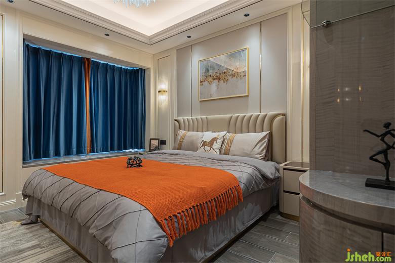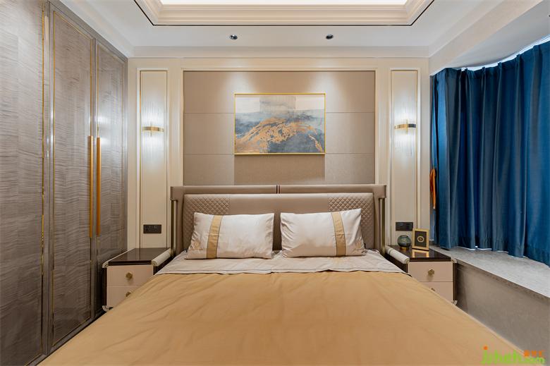 大平層設計主臥區(qū)域以暖白色護墻板為主,床鋪背景搭配素色硬包,藝術掛畫、水晶壁燈及床品的合理搭配,既營造出溫馨浪漫的休息空間,又使得整個主人房更加柔和、高貴、優(yōu)雅。
