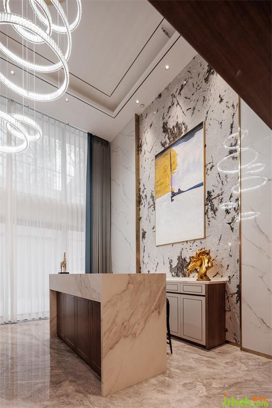 開放式餐廚空間,簡練線條托起華美肌理,別墅設計色調(diào)與材質(zhì)呈現(xiàn)珠聯(lián)璧合的疊加魅力,兼以藝術裝飾調(diào)味精致細節(jié)。