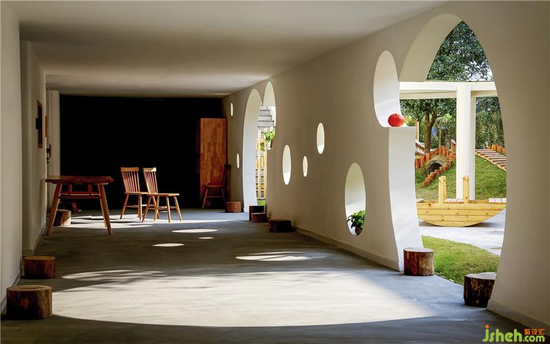 在改造前,光墨書院的走廊一直處于封閉狀態(tài),切斷了人們與季節(jié)的交流,CROX闊合用一個(gè)又一個(gè)的不同大小的圓將外墻打通,陽(yáng)光、風(fēng)雨、蟲鳴——所有自然的美得以穿越空間,在孩子們自由奔跑的走廊上與他們交談,給他們啟發(fā)。隨著季節(jié)的變化,光影的位置、強(qiáng)度,戶外的風(fēng)景、溫度、聲音都各不相同,無論在書院的哪一個(gè)角落,孩子們都能體會(huì)到季節(jié)更迭,節(jié)氣變化,也對(duì)耕讀文化有了更深的理解。裝修公司