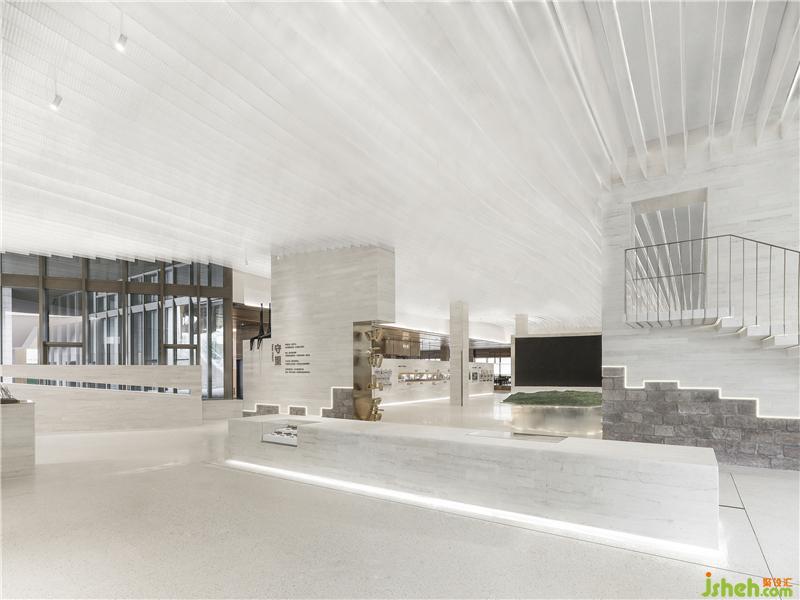 水流的蜿蜒流動(dòng),如同紐帶,串聯(lián)起了空間中的新媒體,引導(dǎo)人們進(jìn)入新的空間,伴著水景向下感受水面與建筑的互動(dòng),在轉(zhuǎn)角處,進(jìn)入開闊的藝術(shù)館前廳。