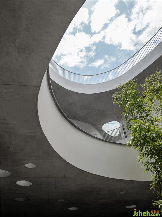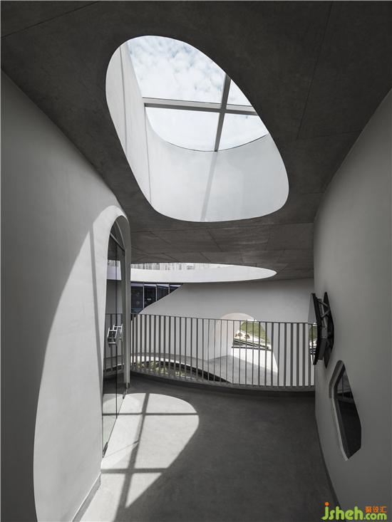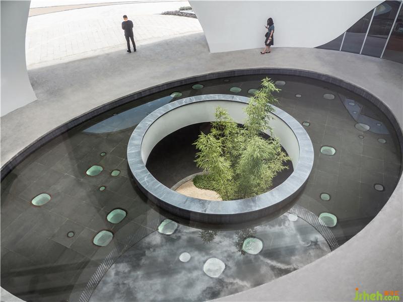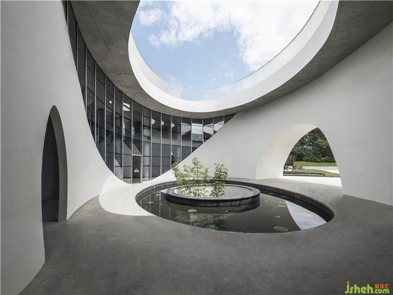 由經(jīng)開孵化園入口不遠(yuǎn)處,首先會(huì)看到一棟白色小樓,潔白的建筑表面,有機(jī)排列著水滴形開窗,在陽光照射下閃爍。半月形的水池由上而下構(gòu)成了流瀑,水聲洗滌著過往的喧囂;半圓形的大門與圓形地臺(tái),上下呼應(yīng),形成鏡花水月的隱喻。穿過門洞抵達(dá)內(nèi)部中庭,映入眼簾是一個(gè)偌大橢圓形水池,天光從水面反射于周圍弧形玻璃窗,在白墻上留下光景。水池中的圓洞,形成與地下相連的天井,微露出青蔥的竹子。光透過竹葉與池底的菱形玻璃,伴隨著下方樹影婆娑的光波點(diǎn),譜寫出奇妙的水光協(xié)奏曲。小白樓的中空部分保留給了天與地,伴隨光影時(shí)序變化,再現(xiàn)幽玄的自然境界。