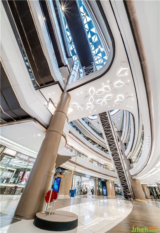 空間整體狹長(zhǎng)有余、空曠不足,如何營(yíng)造整體的流暢感,并在這個(gè)基礎(chǔ)上形成高效的人流動(dòng)線,提高空間的使用率,成為設(shè)計(jì)要解決的首要問題。在商場(chǎng)的主中庭,LB凌奔設(shè)計(jì)架起一座從一樓直通五樓的“飛天梯”,達(dá)到了最高效的人流輸送。這對(duì)于一個(gè)規(guī)模100000㎡的商業(yè)綜合體意義重大,意味著最大客流接待能力10%的提升。