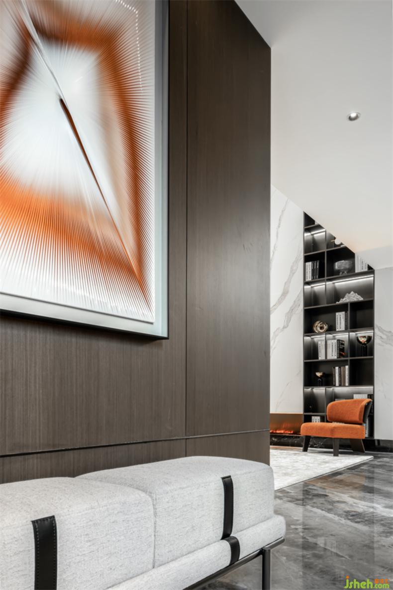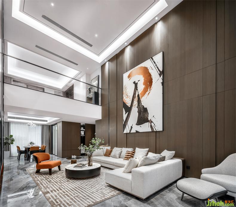 作為社交的中心,客廳充分契合主人疏朗的個(gè)性,頂層復(fù)式設(shè)計(jì)雙層挑高打通增強(qiáng)了空間開闊性。整體以淺色為基調(diào),墻體通過大面積的白色、沉穩(wěn)莊重的棕色映照,格局大氣自帶溫潤秩序感,搭配通透絕佳的自然采光,留白與平靜淡遠(yuǎn)的布局,通過橙色沙發(fā)、現(xiàn)代抽象畫、綠色植物的加入調(diào)動(dòng)了整個(gè)空間的氛圍,置身其中讓人獲得內(nèi)心秩序的平衡與安寧的光陰。