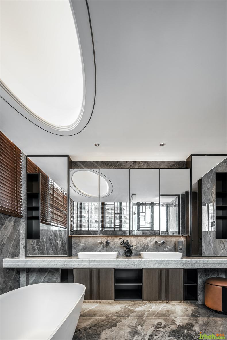 主衛(wèi)大塊面的玻璃間隔,令空間產(chǎn)生視覺上的想象和延展。一輪橢月與地面對應(yīng),象征季節(jié)輪轉(zhuǎn)與人間圓缺,地面大理石的肌理,大氣寬敞的雙臺盆與墻出水龍頭設(shè)計,處處都在體現(xiàn)著男女主人尊貴的地位身份。