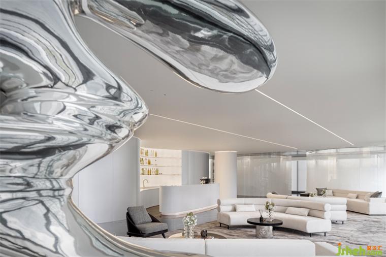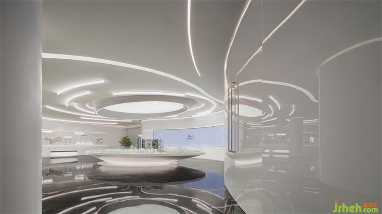 展示空間服務于商業(yè)目的,“如何塑造項目獨特的傳播符號”成為設計的重要課題。LB凌奔設計將曲線語言延伸到空間整體,在形體、動線、家具之間一以貫之,形成整體性的體驗感。從而讓人們領會到這種普遍的聯系,展示中心設計形成本案的獨特記憶。