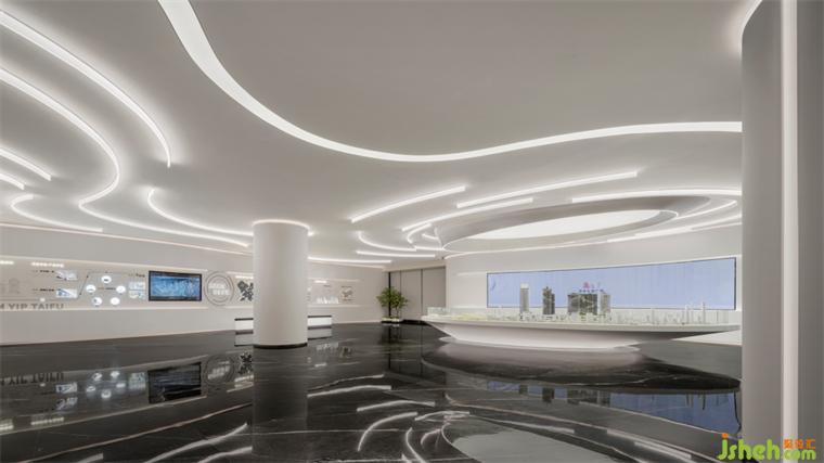 這種體驗(yàn)從看見(jiàn)建筑、進(jìn)入空間的一剎那即開(kāi)始,流光的建筑外觀,大堂和接待臺(tái)造型的藝術(shù)流線,天花燈帶如星軌般延伸向遠(yuǎn)方,半漂浮態(tài)的沙盤(pán)區(qū)域,一切的空間語(yǔ)言帶給人們強(qiáng)烈的震撼,展示中心設(shè)計(jì)帶著欣賞的眼光開(kāi)始這一程空間之旅。