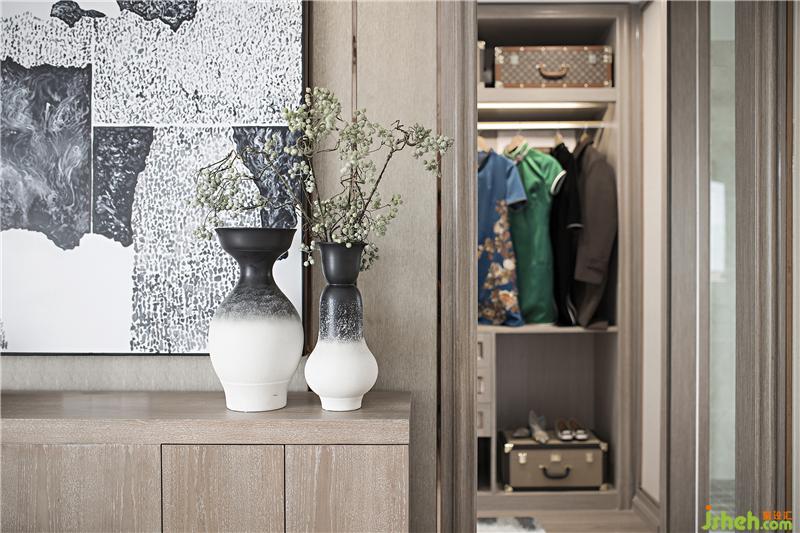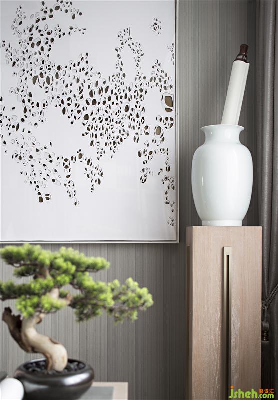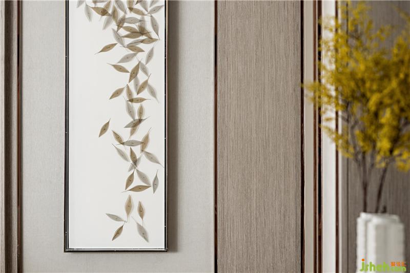淺木色色系為主,荼白、黛綠、緋紅的元素點綴其中,視覺上顏色高度和諧,一種低調卻不失講究的精致感悄然流露。設計師以傳統(tǒng)的藝術脈絡,樣板房設計通過細節(jié)串聯(lián)了整個視覺空間。