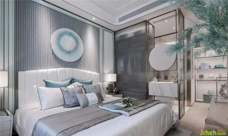 臥室是人們心所歸處。主臥利用步入式衣帽及展示柜。開放式主臥衛(wèi)生間、衣帽間、女主人的化妝臺交叉功能,樣板房設計面積配比不再是局限。蒂芙尼藍柔和的色彩提升幸福感和歸屬感。時尚與美學在其中跳躍,驚起一絲慵懶與愜意的波瀾,又平添一份驚鴻一瞥的包容。
